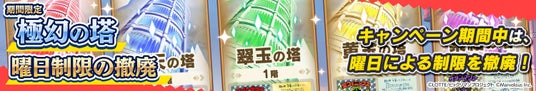 キャンペーン期間中は、曜日による制限を撤廃して、毎日「紅焔の塔」「蒼天の塔」「翠玉の塔」「黄金の塔」「紫紺の塔」を登ることができます。