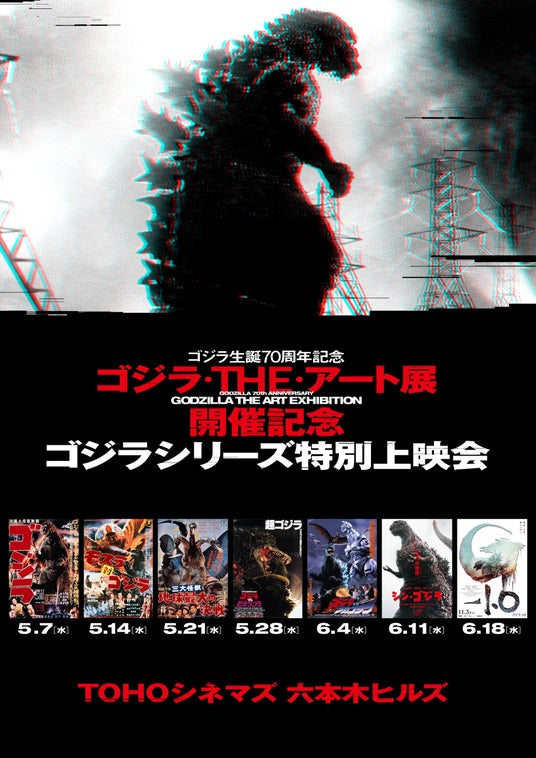 森アーツセンターギャラリー(六本木ヒルズ森タワー52階)にて好評開催中の「ゴジラ生誕70周年記念 ゴジラ・THE・アート展」。その開催を記念し、お隣のTOHOシネマズ六本木ヒルズにて5月7日(水)~6月18日(水)までの間、「ゴジラシリーズ特別上映会」の実施が決定いたしました!