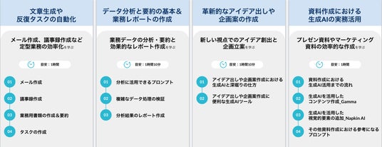 実践重視: 文章生成・資料作成・データ要約など “そのまま業務で使える” 課題設計