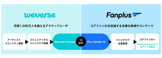 Fanplusが運営するファンクラブを利用しているアーティストは、今回のID連携を採用することでWeverseの公式コミュニティ上に既存のファンクラブへの入会導線を設けることができ、WeverseユーザがファンクラブのコンテンツをWeverse Accountで楽しむことが可能となります。