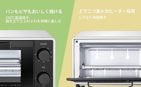食材に合わせて温度(80~230℃)と時間をダイヤルで細かく設定できるので、トーストからグラタンまで幅広い調理に対応可能。上下2本の高火力ヒーターが食材をムラなく加熱し、外はカリッと中はふっくらと美味しく焼き上げます。忙しい朝でも手軽に本格的な朝食を楽しめる、便利な一台です。