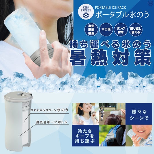 やわらかいシリコン製の氷のうを、真空断熱構造のステンレスボトルに入れて持ち運べる