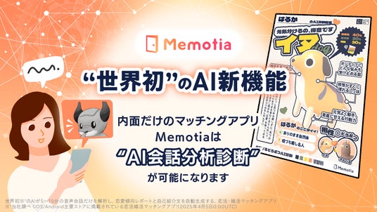 株式会社Flamers(本社:東京都目黒区、代表取締役:佐藤 航智)は、2025年5月2日より、内面だけのマッチングアプリ「Memotia」に4つのAI新機能を正式リリースいたします。