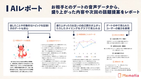 ユーザー同士のデート内容をAIが分析し、「盛り上がったトピック」「見え隠れする価値観」などをまとめたレポートを生成。 「次のデートではこんな話題を…」といった提案で次のデートのサポートを実現。