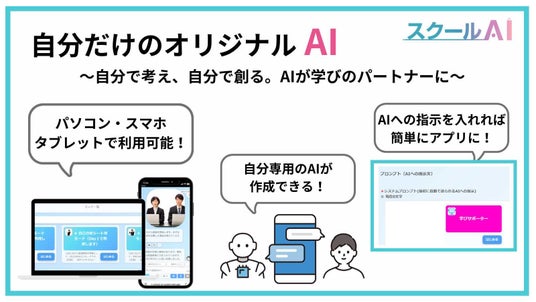 本機能により、スクールAIを利用する生徒は、自らのアイデアをベースに、英会話練習、作文添削、クイズ出題など、自分専用の学習アプリを自由に作成することが可能となります。