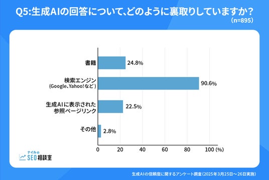 生成AIの回答を裏取りする際、最も多く利用されているのは圧倒的に「検索エンジン」で、実に9割以上のユーザーがGoogleやYahoo!などを活用しています。