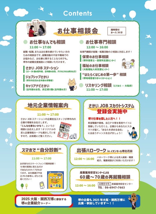 各専門機関による個別就職相談のほか、市内企業の求人情報の提供、さかいJOBスカウトシステムの登録会等を行います。予約不要、無料で参加いただけるお仕事探しに役立つ情報満載のイベントです。