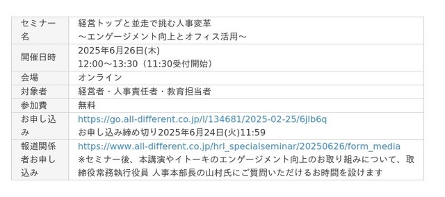 累計20,000社420万人以上の組織開発・人材育成を支援するALL DIFFERENT(オールディファレント)株式会社(所在地:東京都千代田区 代表取締役社長:眞崎大輔)は、スペシャルセミナーを6月26日(木)に開催いたします。本講演では、株式会社イトーキ 取締役常務執行役員 人事本部長 山村善仁氏をお招きし、「経営トップと並走で挑む人事変革~エンゲージメント向上とオフィス活用~」というテーマでお話しいただきます。セミナー後には、記者の方からの質疑応答の時間を設けます。