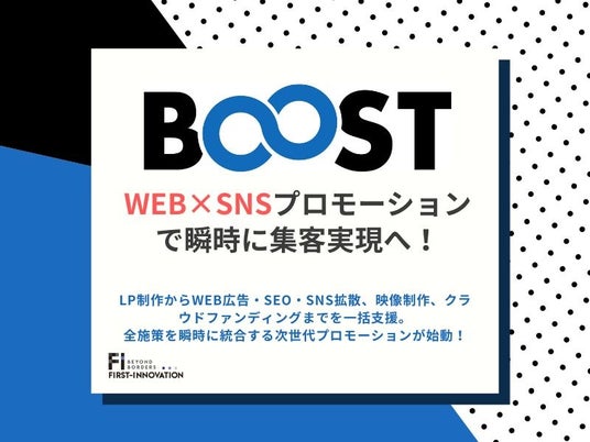 株式会社ファーストイノベーション(本社:東京都中央区、代表取締役社長:木ノ根雄志、以下ファーストイノベーション)は、確実な集客とプロモーション成果が求められる現代において、成果に直結する各種施策を“一気通貫の体制でスピーディに提供する”新サービス「BOOST∞(ブースト・インフィニティ)」を正式にリリースいたしました。