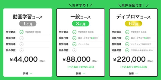 動画学習のほか、課題原稿5本を講師と1対1のオンライン個別指導で仕上げる特別コース。不明点はチャットで直接相談ができ、卒業後は5万円分の記事制作保証があります。学習期間:6ケ月