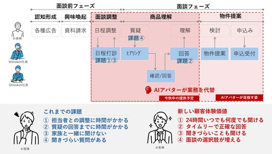 本サービスは、お客様にご納得いただけるまで、24時間いつでも面談が可能であり、これまでWebや対面だけであったコミュニケーション手段に加え、「生成AIアバター」という選択肢を提供します。また、対人では気を遣う質問も、生成AIアバターには気兼ねなく聞くことが可能になると考えております。