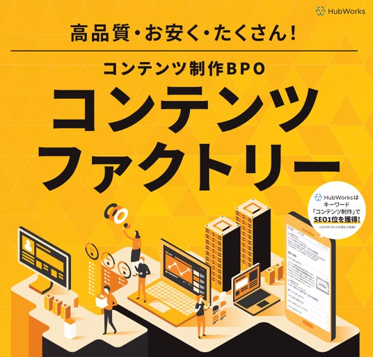 株式会社HubWorksは、企業のマーケティング活動を支援する コンテンツ制作BPO事業「コンテンツファクトリー」を展開する会社です。SEO記事、ホワイトペーパー、動画、マンガ、LP制作など、多様な形式のコンテンツ制作をワンストップで提供しています。