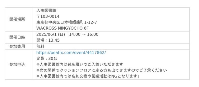 2024年4月1日に東京人形町にオープンした、人事関連職が集まるコワーキング×コミュニティ。2500冊以上の人事に関する書籍と600名以上の会員を有しており「仲間と学びで、未来を拓く」をスローガンに運営している。