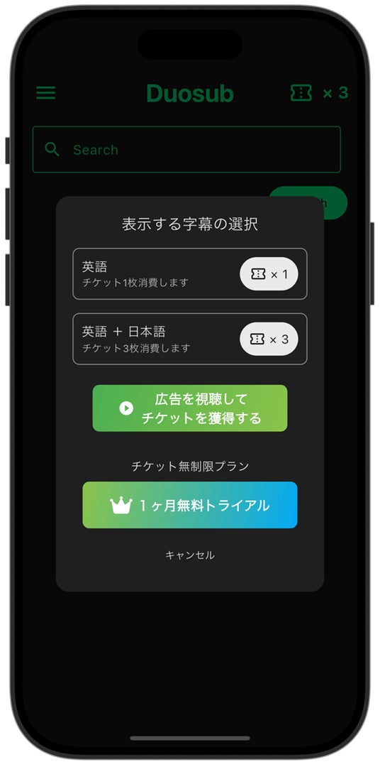 今まで、Duosubの機能を利用するには、事前に広告を見ることによってチケットを獲得する必要がありましたが、本アップデートによって追加されたサブスクプランに加入することで、広告を見ずに全機能を利用することができます。サブスクプラン詳細