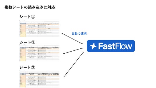 多くの企業では、製品やサービスカテゴリ、問い合わせ種別ごとにFAQ情報をシートで分けて管理しています。従来のFastFlowでは、参照するテンプレートをファイル単位で指定する必要がありましたが、今回のアップデートにより、1つのスプレッドシートファイル内の複数シートを一括で読み込み、テンプレートとして活用できるようになりました。
