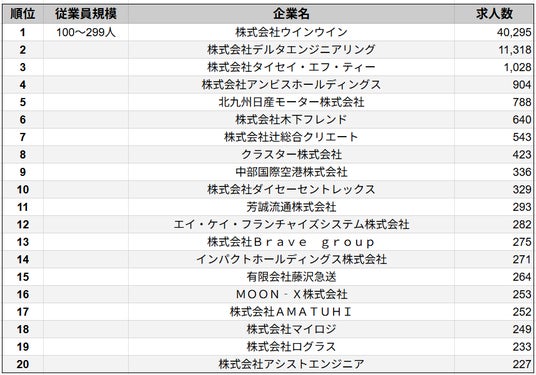 株式会社SalesNow(本社:東京都渋谷区、代表取締役:村岡功規、以下「当社」)は、国内540万社の企業情報を完全網羅した日本最大級のデータベース「SalesNow DB」より、2024年4月1日~2025年4月1日の期間における求人データ(※アルバイト媒体を除く)をもとに、「従業員数100~299人」の企業における求人数ランキングTOP20を集計・発表いたしました。