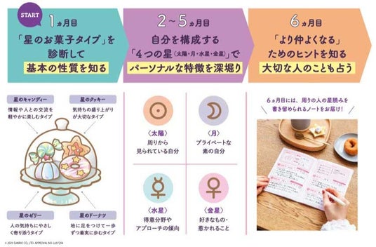 星のクッキータイプ、星のドーナツタイプ、星のキャンディータイプ、星のゼリータイプという「4つの星のお菓子タイプ」でまずは自分のタイプを診断。それをもとに基本の性質や周りからどう見られているか、素の自分の性格、コミュニケーションの癖、なぜか心惹かれることなど、自身の個性を深堀りしていくカリキュラムになっています。