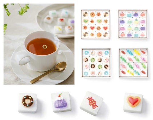 お菓子がアイシングのモチーフになった、ミニチュアみたいにかわいいティーシュガーのセットです。クッキー、ドーナツ、キャンディー、ゼリーの前4種類。あたたかい飲みものに入れて、アイシングが浮かんできたらYES、そのままならNO……なんてぷち占いも楽しめます。