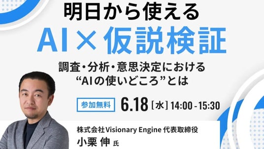株式会社ビジョナリーエンジン(本社:東京都港区、代表取締役:小栗 伸)の代表 小栗伸が、株式会社ビザスク(本社:東京都目黒区、代表取締役社長:端羽英子)が開催するオンラインセミナー「明日から使える AI × 仮説検証 調査・分析・意思決定における “AI の使いどころ” とは」に2025年6月18日(水)に登壇します。