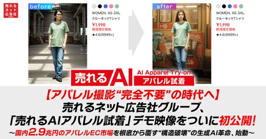 売れるネット広告社グループ株式会社(本社:福岡県福岡市、代表取締役社長 CEO:加藤公一レオ、東証グロース市場:証券コード 9235、以下 売れるネット広告社)の連結子会社である売れるネット広告社株式会社は、アパレルEC企業の収益最大化を支援するAI画像合成サービス『売れるAIアパレル試着』について実際の独自アプリを利用した際のデモ映像を公開いたしました。