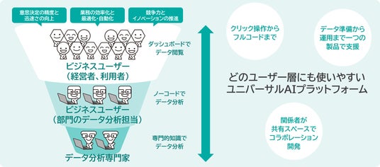 データドリブン経営をめざす企業が増加し、大量のデータを学習することで予測・検知を実現するAIの開発や、生成AIによる業務支援への需要がますます高まっています。意思決定のスピードと精度を向上させ、競争力を強化したい企業にとって、データ分析専門家に限らず、誰もがデータにアクセスしてAIを活用できるプラットフォームは重要です。