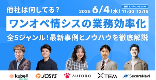 SecureNavi株式会社(本社:東京都港区、代表取締役CEO:井崎友博)は、株式会社kubellストレージ、ジョーシス株式会社、オートロ株式会社、エクステム株式会社と共同で、「ワンオペ情シスの業務効率化セミナー 全5ジャンル!最新事例とノウハウを徹底解説」と題した無料オンラインセミナーを開催いたします。