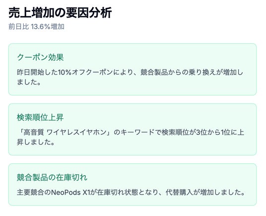 自社の施策と競合の動きを踏まえて、「なぜ売上が変わったか?」の仮説を毎日レポーティングします。