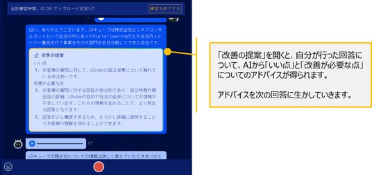 また、自分の回答について「改善の提案」というボタンを開くと、AIからのアドバイスが得られます。