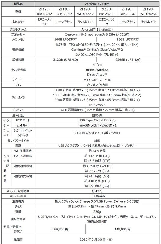 ●Zenfone 12 Ultraの製品仕様概要と発売日および希望小売価格