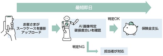 お客さまに撮影いただいた破損したスーツケースの画像をAIが読み取り、破損の有無と状態を自動判定することが可能となりました。本サービスの導入により、スーツケース破損の画像査定を自動化することで、担当者による損害確認や支払手続きなどの作業が不要となることによって、これまで最短3日かかっていた保険金支払を最短即日で行うことが可能となります。