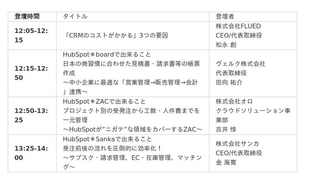 本セミナーは、株式会社FLUED、ヴェルク株式会社、株式会社サンカ、株式会社オロの共催により実施され、各社が「CRM」をテーマに登壇します。オロは「HubSpot*ZACで出来ること」を軸に、「HubSpotとZACの連携による、CRM・SFAから管理会計・財務会計まで一気通貫の管理方法」について解説します。