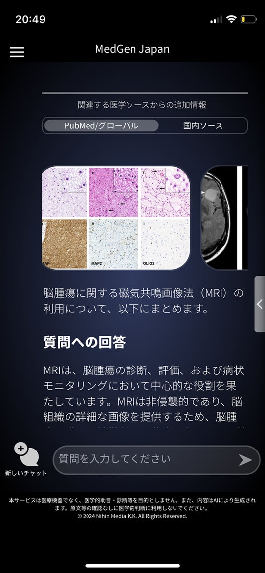 MedGen Japanでは、質問後0~3秒ほどで初期回答が表示され、その後、大量の文献を読み込んで信頼性によるスクリーニングを経て、引用付きの追加回答を出力します。