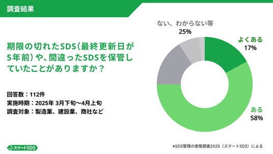 実際、弊社がSDSを扱う100以上の企業に対して実施したアンケート調査では「期限の切れたSDS(最終更新日が5年前)や、間違ったSDSを保管していたことがありますか?」という設問に対して、75%の企業が「よくある」または「ある」と回答しました。