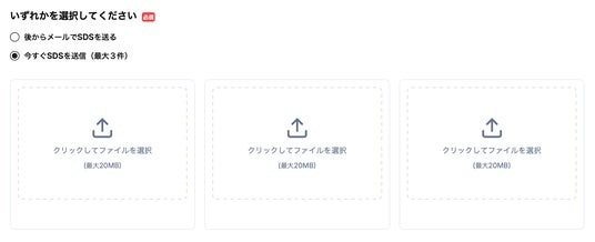 フォームからSDSをアップロードするだけで診断の申し込みが完了します。社内のご都合ですぐにSDSを送信できない場合は、後日メールでの送信も可能です。この場合にも、診断枠を先に確保できますのでご安心ください。