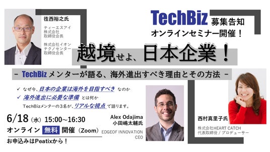TechBiz2025の公募開始にあわせて、セミナー「越境せよ、日本企業!-TechBizメンターが語る、海外進出すべき理由とその方法-」を開催します。