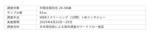 株式会社Quest Research(本社:東京都港区、代表取締役:南健太)は、生成AIを活用したインタビューサービス「qork(コルク)」を活用し、中国全国在住20~69歳を対象にした自主調査を実施しました。