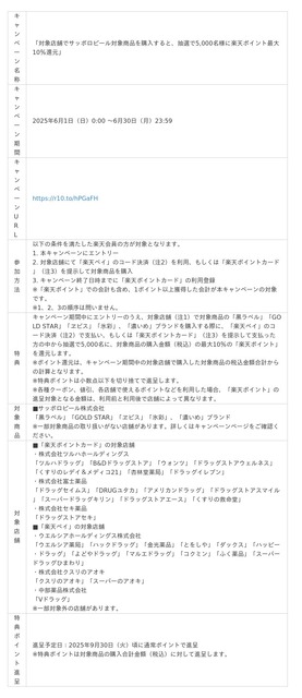 楽天ペイメント株式会社(以下「楽天ペイメント」)は、キャッシュレス決済サービス「楽天ペイ」と共通ポイントサービス「楽天ポイントカード」において、「対象店舗でサッポロビール対象商品を購入すると、抽選で5,000名様に楽天ポイント最大10%還元」キャンペーンを、2025年6月1日(日)から6月30日(月)まで実施します。