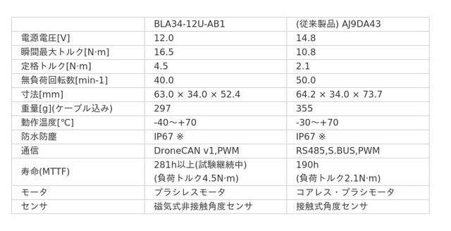 「BLA34」シリーズは、これまで当社ハイトルクラインアップになっておりました従来製品(「AJ9DA」シリーズ)と同等のサイズでありながら、2倍以上となるトルク性能を持ち、防水・防塵規格・CAN通信に対応しております。12V仕様と28V仕様の2機種をご用意し、UAV市場、産業機器市場をはじめ、幅広い分野でご利用いただける製品となっております。