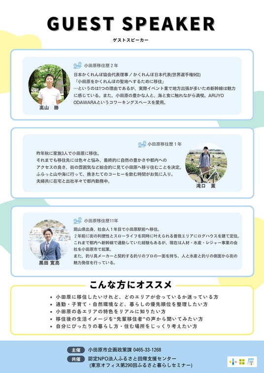 本セミナーでは、小田原市内の異なる地域に移住した3組の先輩移住者がゲストスピーカーとして登壇。それぞれのエリアの特色や、実際の暮らしの様子をお話ししながら、参加者との質疑応答を交えて「小田原での暮らしのリアル」に迫ります。