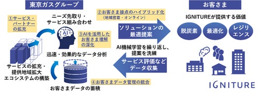 IGNITUREは、東京ガスが安心・安全・信頼のコーポレートバリューによってこれまで築いてきた顧客基盤やエネルギーマネジメントのノウハウと、GX(グリーントランスフォーメーション)やDX等の先進的技術を融合させ、新たなソリューションを提供する事業ブランドです。サービスの拡充と提供の仕組み構築を進め、より充実したソリューションを提供するべく、1.サービス・パートナーの拡充、2.お客さま接点のハイブリッド化、3.AIを活用したお客さま理解の深化、4.お客さまデータ管理の統合を推進しています。