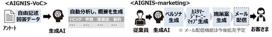お客さまの声をAI分析する「AIGNIS-VoC」や、顧客分析からマーケティング施策提案まで自動で行う「AIGNIS-marketing」等、生成AI搭載アプリを独自開発し、活用しています。業務効率化に加え、お客さま一人ひとりの理解の深化、課題発見・解消による質の高いCXを実現することで、企業文化の変革にも寄与しています。