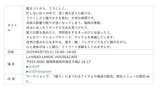 株式会社 LANDIC ホールディングス(代表取締役社長 兼 グループ CEO 中山 朋幸、以下「LANDIC」)は、 株式会社ふくおかフィナンシャルグループ(取締役社長 五島 久、以下「FFG」)と共同で取り組んでいる「 FFG × LANDIC Womanʼ s Wellness Project」主催のイベントを開催いたします。ワークショップやトークセッション、様々なアイテムを実際に手に取りながら「眠るコトから、うつくしく。」を体験・体感できるリアルイベントをご提案します。