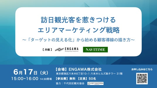 ENGAWA株式会社(本社:東京都港区、代表取締役:牛山隆信)は、株式会社ナビタイムジャパン(本社:東京都港区)と共同で、「訪日外国人観光客の誘致に特化した実践的なエリアマーケティング戦略セミナー」を2025年6月17日(火)に開催します。本セミナーでは、一般社団法人千代田区観光協会(所在地:東京都千代田区)をパネリストに迎え、地域に根差した観光プロモーションの成功事例を紹介いただきます。