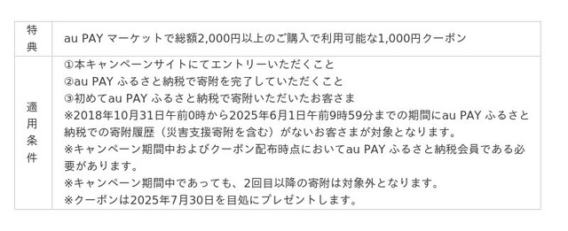 そのほか、初めてau PAY ふるさと納税で寄附されるお客さまには、au PAY マーケットで利用可能な1,000円割引クーポンをプレゼントします。