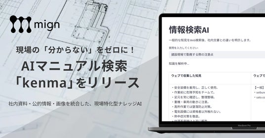 株式会社mign(本社:東京都渋谷区、代表取締役CEO:對間 昌宏)は、現場業務における即時的なナレッジ活用を支援するAI検索ツール「kenma(ケンマ)」を、2025年5月にリリースいたしました。