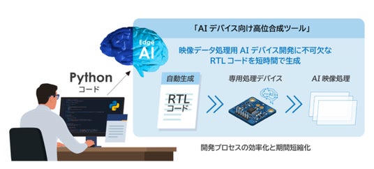 本ツールは、映像データ処理用AIアルゴリズムが記述されたPython(パイソン)コードから、集積回路であるFPGAなど、ハードウェアの回路図となるRTLコードを、短時間で自動生成するソフトウェアです。専門技術者でなくても映像データ処理用AIデバイスの設計が可能となり、開発期間を大幅に短縮できます。また、本ツールで生成されたRTLコードを実装したFPGAで実証したところ、GPUを搭載したエッジ端末に比べ、40倍以上の高い電力効率が得られることを確認しました。