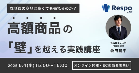 EC向け積立決済SaaS「Respo(リスポ)」を提供する株式会社リスポ(本社:東京都港区、代表取締役:黍田龍平)は、2025年6月4日(水)に、EC担当者向けオンラインセミナー「なぜあの商品は高くても売れるのか?高額商品の『壁』を越える実践講座」を開催します。