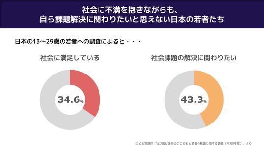 こども家庭庁が実施した「我が国と諸外国のこどもと若者の意識に関する調査(令和5年度)」によれば、日本の13~29歳の若者で「社会に満足している」と回答したのは34.6%と、主要国平均49.3%を大きく下回っています。一方で、「不満である」と回答した割合は50.8%にのぼり、こちらも主要国平均43.7%を上回る高い水準となっています。さらに、「社会の課題解決に関わりたい」と回答した割合は43.3%にとどまり、主要国平均(59.8%)を下回りました。