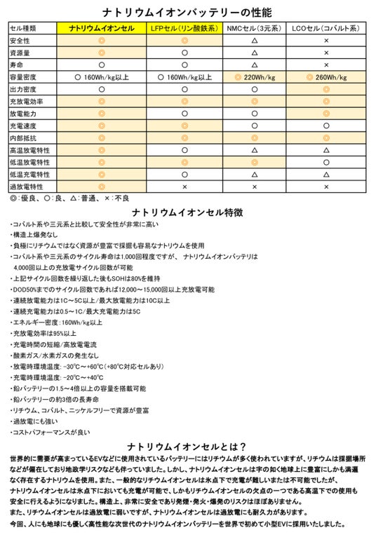 ナトリウムイオンバッテリーの特徴は、以下の通りです。