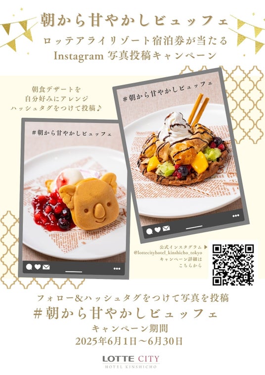 朝食デザートスペースがさらに充実したことに伴い、Instagram投稿キャンペーンを実施。お客さまがお好みでアレンジしたワッフルまたはコアラのマーチパンケーキの写真をホテル公式Instagram(@lottecityhotel_kinshicho_tokyo)に投稿すると、系列ホテル「ロッテアライリゾート」の宿泊券が抽選で当たります。